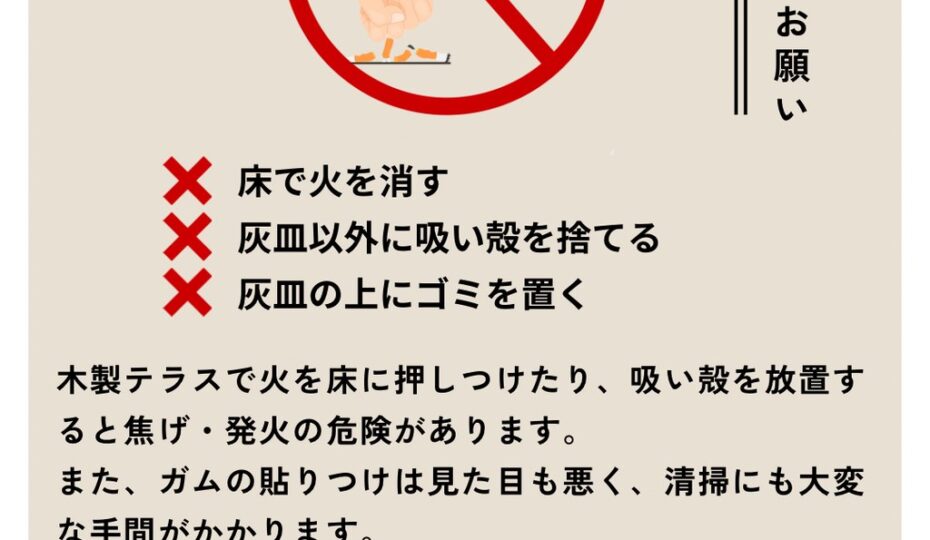 テラスの床は木製のため、焦げや火災の危険もあり大変困っています。